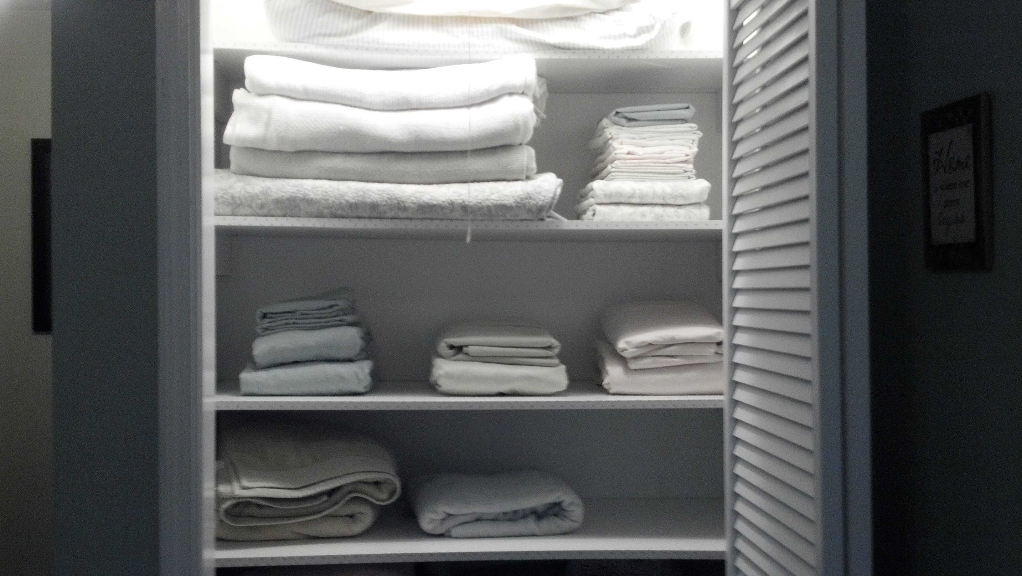 When I began my staging process I started with closets. It’s easier to pack up the small stuff I don’t need or see everyday first. I started with the linen closet and packed up all the spare sheets, blankets and towels, leaving just enough for our family and one extra set.