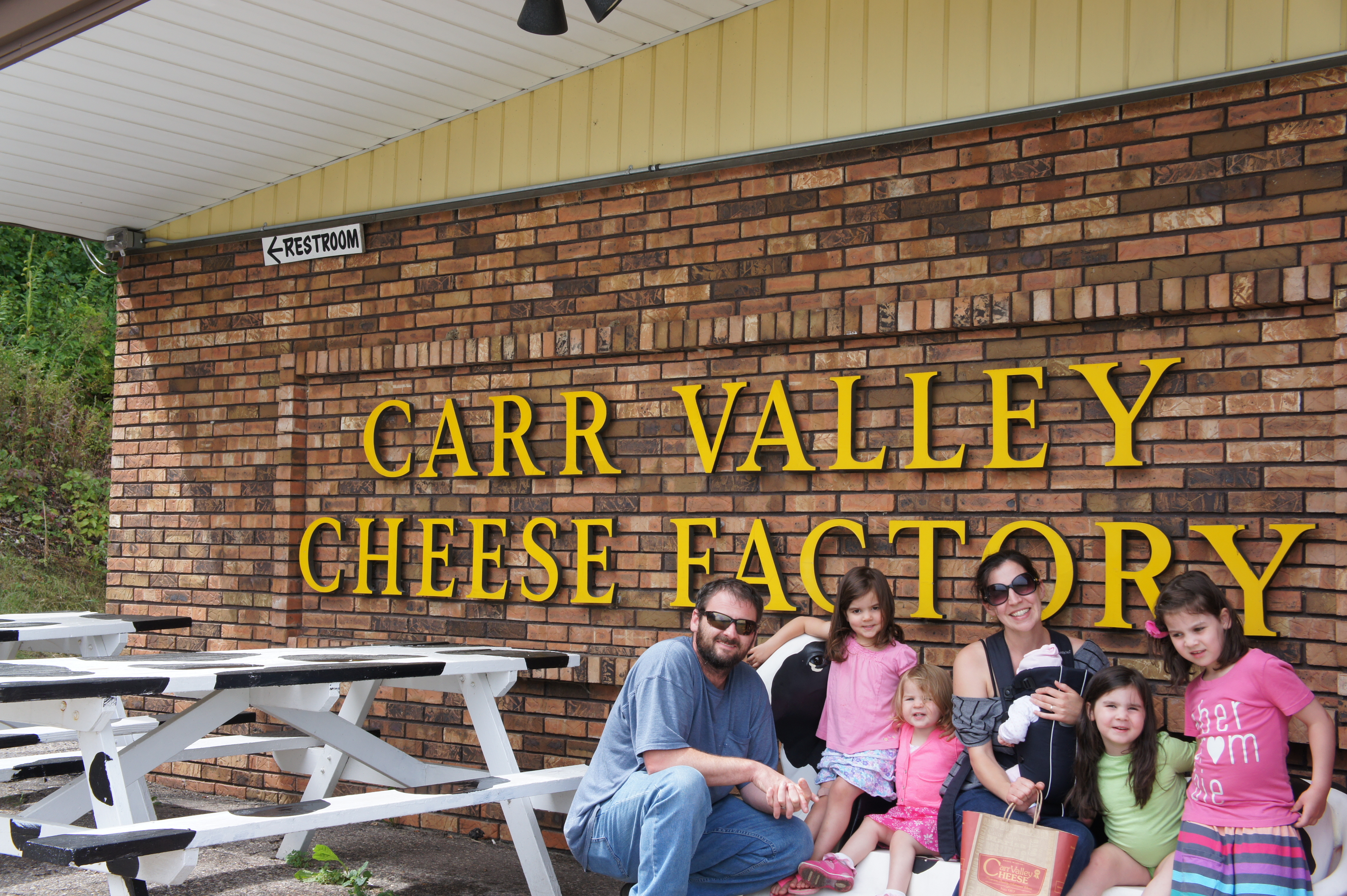 After a video tutorial of cheesemaking we sample some curds, pick out postcards and take this family photo.